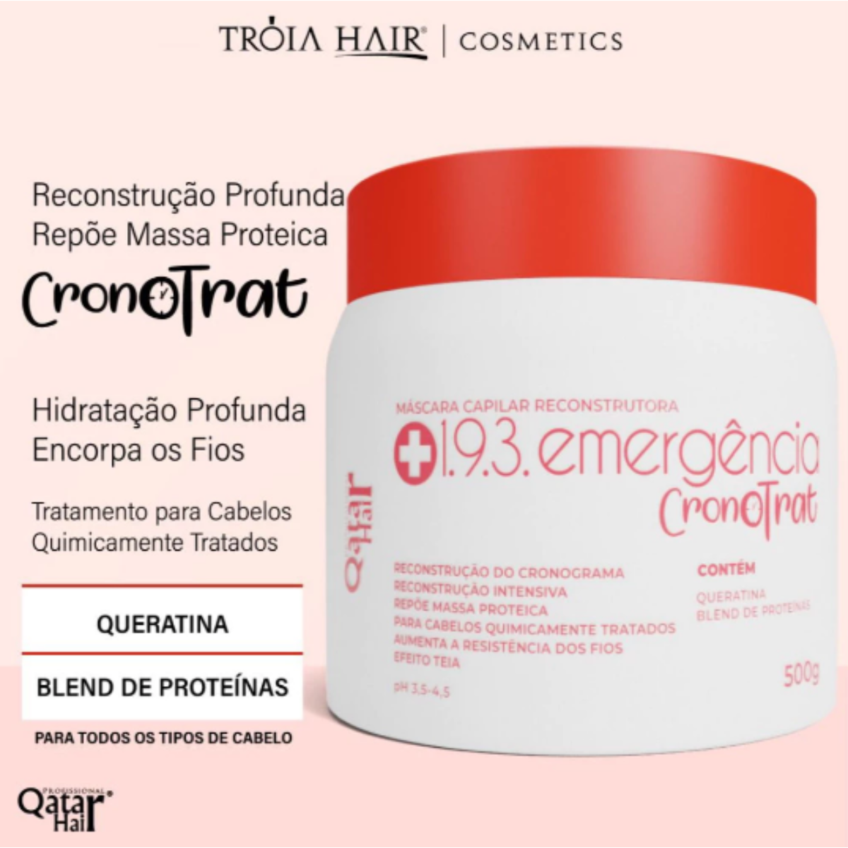 A Máscara Capilar Emergência Cronotrat 1.9.3 Qatar Hair 500g é um produto revolucionário que se destaca por sua capacidade de transformar cabelos danificados e com pontas duplas em uma única aplicação. Esta máscara é uma verdadeira joia no mundo dos cuidados capilares, oferecendo uma ampla gama de benefícios que a tornam essencial para a saúde e a beleza dos seus cabelos.