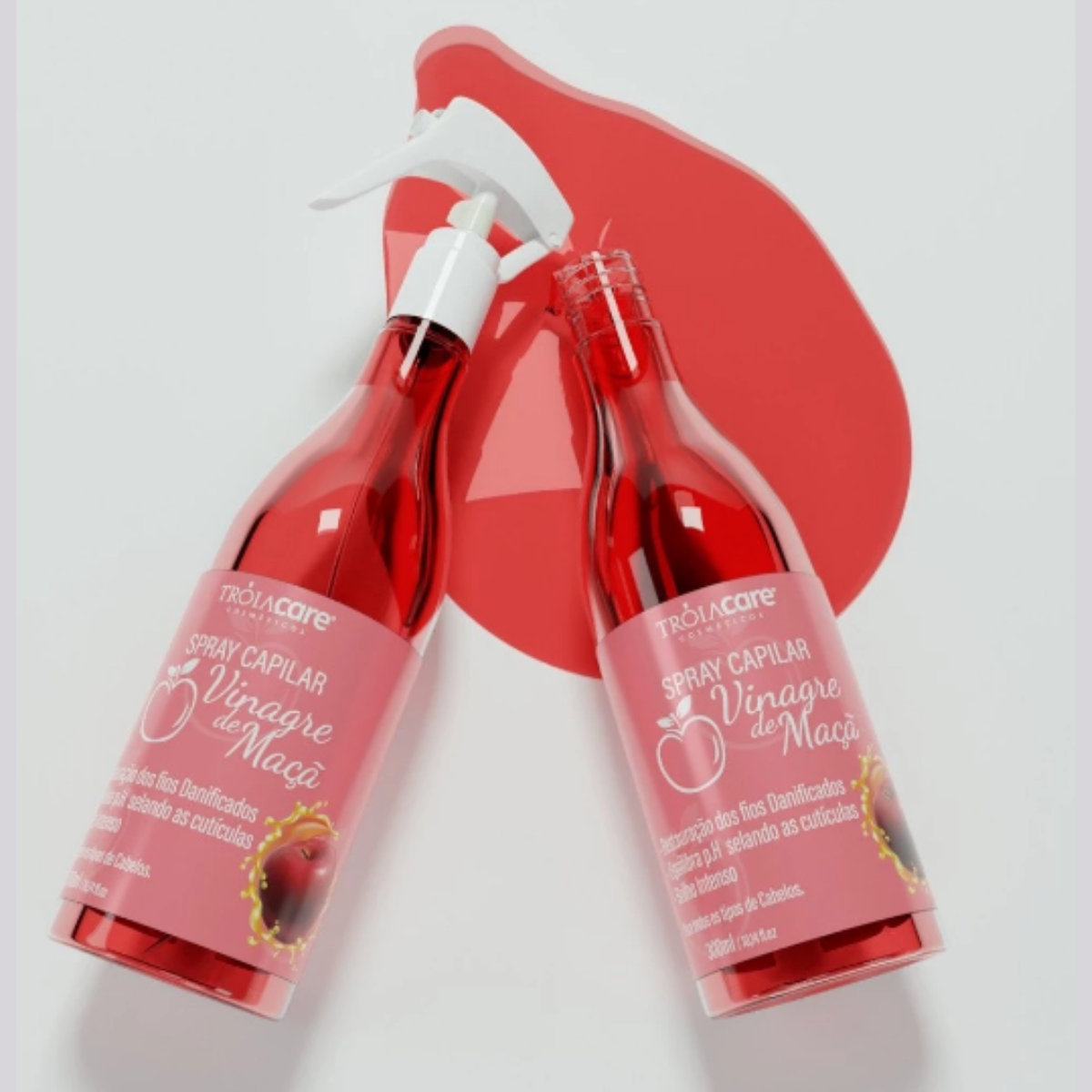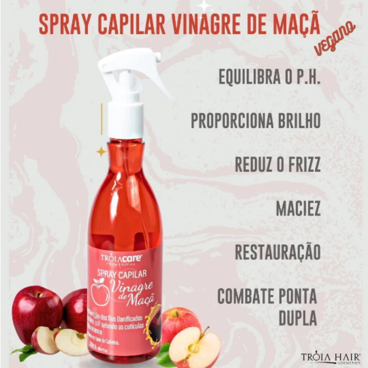 O spray Capilar Vinagre de Maçã Troia Care® age como restaurador para os cabelos danificados sem brilho, e com pontas duplas.